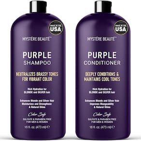Revele cabelos vibrantes e luminosos com o conjunto de shampoo e condicionador Mystere Beaute Purple. Essa dupla dinâmica é especialmente formulada para neutralizar os tons de bronze, amarelo e laranja em cabelos loiros, grisalhos ou com mechas, restaurando um brilho fresco e cinza. Os pigmentos roxos fazem sua mágica, neutralizando o calor indesejado enquanto limpam e nutrem suavemente seus fios. Enriquecido com ingredientes nutritivos, este conjunto deixa o cabelo sedoso, maleável e radiantemente tonificado. Perfeito para manter a tonalidade gelada desejada entre as visitas ao salão, este conjunto é essencial para quem quer reviver sua crina loira ou prateada. Abrace o poder do roxo e deixe seus cabelos brilharem com um acabamento vibrante e multidimensional. Para obter melhores resultados, use o shampoo e o condicionador semanalmente ou conforme necessário para manter o tom desejado.