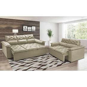 Informações do Produto: *Assentos: Feitos com espuma D33, Fibra Siliconada, Percintas Elásticas e Madeira de Eucalipto, sua estrutura foi desenvolvida para dar mais qualidade e praticidade ao seu dia a dia. *Encosto: Possuindo 5 níveis de estágios, seus encostos são reclináveis. Suas almofadas do encosto são removíveis, podendo retira-las da base. Além disso são compostas de 80% fibra siliconada, 20% flocos de espuma que proporcionam maior conforto. *Braços: Com design lindo e almofadado, seus braços medem 20cm de largura cada um e são feitos com espuma D33. *Estrutura: É utilizada a Madeira de Eucalipto 100% de reflorestamento, sendo um produto ecologicamente correto e sustentável. Para fixar as partes, são utilizados grampos galvanizados, permitindo uma melhor fixação da estrutura. *Tecido: Com um toque macio e gostoso, o tecido utilizado é o Suede Velusoft.
