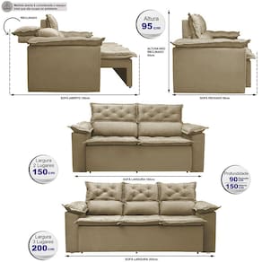3 Lugares: Altura: 95cm Profundidade fechado: 90cm Profundidade aberto: 150cm Largura: 200cm Quantidades de Lugares: acomoda até 3 pessoas