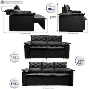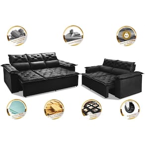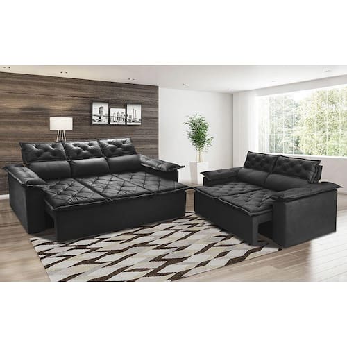 Conjunto de Sofá 3 e 2 Lugares Retrátil e Reclinável Cama inBox Compact 2,00x1,50m Velusoft Preto - Preto