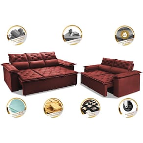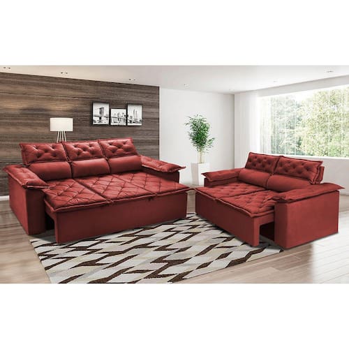 Conjunto de Sofá 3 e 2 Lugares Retrátil Reclinável Cama inBox Compact 2,00x1,50m Velusoft Vermelho