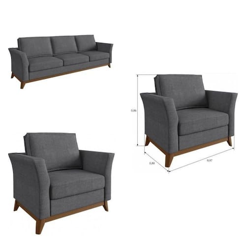 Esse conjunto é composto por 1 sofá de 3 lugares e 2 poltronas. Produzidos com materiais de primeira linha, madeira de eucalipto tratada ecologicamente correta, espumas certificadas com tecnologia contínua oferecendo mais elasticidade e resistência, percintas elásticas, tudo isso revestido com tecidos de alta qualidade fabricado no Brasil, proporcionando maior durabilidade ao seu sofá e/ou poltrona sem abrir mão do seu conforto.