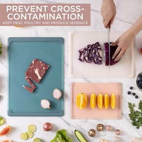 COZINHE COM CORES — Nós realmente nos preocupamos em adicionar o estilo e a aparência certos à sua cozinha. Com nossos produtos, você vai adorar sua cozinha e criar o paraíso com que sempre sonhou. Nosso conjunto de 3 tábuas de corte de plástico são excelentes itens essenciais para a cozinha. Com este conjunto de 3, há uma tábua de cortar para tudo. Os tamanhos pequeno, médio e grande são ótimos para carnes, peixes, vegetais, frutas e queijos. Segurança e saúde são uma grande preocupação para nós. Cada tábua de corte de plástico rígido sem BPA para cozinhas apresenta bordas de TPR para garantir uma tábua antiderrapante. A superfície de plástico rígido manterá suas facas afiadas, o que é uma grande preocupação para cozinheiros experientes como você! Lindos estilos em cores modernas ajudarão você a criar o design de cozinha que você absolutamente ama. GARANTIA DE 100% DE SATISFAÇÃO DO CLIENTE: Na Cook with Color, nosso objetivo número um é a satisfação do cliente. Por favor, não hesite em nos contatar com quaisquer problemas, perguntas ou comentários para que possamos garantir que sua experiência de pedido do Cook with Color adicione a cor e o sabor certos! - Bordas antiderrapantes: diga adeus aos escorregões e deslizamentos ao cortar! Nossas tábuas de corte são equipadas com lados antiderrapantes, fornecendo uma superfície de corte estável e segura para todas as tarefas da cozinha - Três tamanhos convenientes: este conjunto inclui três tábuas de corte em vários tamanhos - incluindo uma placa XL. Quer você esteja fatiando frutas pequenas ou cortando vegetais grandes, temos a tábua ideal para cada trabalho. - ADICIONE COR E ESTILO - Entendemos as tendências da cozinha, e nossas tábuas de corte de plástico pequenas, médias e grandes em cores bonitas darão um toque incrível à sua cozinha. - LAVÁVEIS NA MÁQUINA DE LAVAR LOUÇA E FÁCEIS DE LIMPAR: Nossas tábuas de cozinha de plástico são livres de BPA e podem ser lavadas à mão para remover manchas após o uso ou lavadas na máquina de lavar louça. - GARANTIA DE 100% DE SATISFAÇÃO DO CLIENTE: Na Cook with Color, nosso objetivo número um é a satisfação do cliente. Por favor, não hesite em nos contatar com quaisquer problemas, perguntas ou comentários para que possamos garantir que sua experiência de pedido do Cook with Color adicione a cor e o sabor certos!