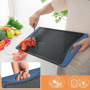- ?Ranhura de suco embutida? Todos os lados da tábua de corte de plástico são projetados com uma ranhura de suco para impedir que líquidos fluam para sua bancada, mantendo a bancada bonita em todos os momentos. E estas tábuas de corte de plástico estão equipadas com alça de borda TPR, que pode ser firmemente fixada no lugar quando você prepara alimentos. E o design da alça também é muito conveniente e fácil de guardar.