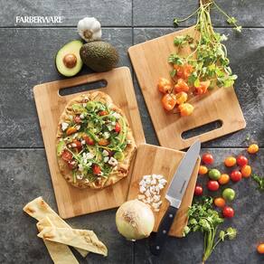 Farberware Conjunto de 3 tábuas de corte de madeira, tábuas reversíveis para preparar e servir refeições, tábuas de charcutaria, tábuas de corte de madeira com alças embutidas, conjunto de 3 tamanhos - Forte e sustentável: este conjunto é feito de bambu, um recurso altamente reabastecível que oferece durabilidade e cuidado fácil - tornando-os um complemento perfeito para a cozinha de qualquer chef - Reversível: esta tábua de corte de bambu tem uma superfície de corte reversível, perfeita para a preparação diária de alimentos, de fatiar frutas a picar vegetais, e é um conjunto perfeito para iniciantes de cozinha, presente de inauguração de casa ou essencial de volta às aulas - Material natural: o bambu é uma alternativa mais forte e natural à madeira, fácil de colocar lâminas de faca, é substancialmente mais forte do que madeiras duras; o bambu é um dos recursos mais renováveis do mundo - Perfeita para entreter: estas tábuas de madeira também podem ser usadas como tábua de charcutaria para queijo, carnes, azeitonas, pães e qualquer outro aperitivo - O conjunto inclui: Este conjunto inclui uma tábua de corte grande: 24 cm por 33 cm, uma tábua de corte média: 21,6 cm por 28 cm e uma pequena tábua de corte: 15 cm por 20 cm