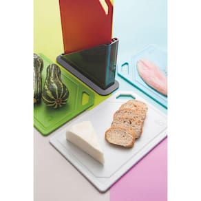 Conjunto de Tábuas de Corte Tramontina Mixcolor com Suporte 5 Peças Quem procura praticidade na hora de preparar suas receitas precisa do Conjunto de Tábuas de Corte Tramontina Mixcolor com Suporte 5 Peças. Cada tábua possui uma ilustração que indica o alimento a ser utilizado, assim você sabe exatamente qual tábua usar no preparo de suas receitas e não corre o risco de misturar ingredientes e sabores, além é claro, de otimizar a higiene de seus utensílios. A tábua na cor azul é para peixes, a verde para legumes e verduras, a vermelha para carnes cruas e a branca para pães e queijos. Praticidade, beleza e descontração estão garantidos, isso sem falar na proteção antimicrobiana, que inibe a proliferação de fungos e bactérias. O jogo conta ainda com suporte que garante a organização da sua cozinha! Informações Gerais Tábuas de polipropileno com proteção antimicrobiana que inibe e reduz o crescimento de fungos e bactérias. Cada tábua possui indicação do tipo de alimento que deve ser usado, reduzindo assim a contaminação entre os tipos de alimentos. São mais duráveis, fáceis de limpar e preservam a beleza e a praticidade no dia a dia. Suporte de ABS proporciona organização para a sua cozinha.