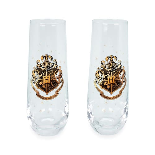 ao mundo mágico Hogwarts está trazendo a você uma experiência gastronômica requintada com este elegante conjunto de vidro. Esta criação mágica vai parecer que você está sendo transportado para o Grande Salão para uma rodada de bebidas. Requintadamente trabalhada, o brasão dourado de Hogwarts adorna esses copos altos de vidro canelados com detalhes encantadores. Elementos decorativos e brilhantes adicionam um toque atraente de capricho. COLEÇÃO DE BEBIDAS PARA POTTERHEADS Coloque estas taças de champanhe sem haste juntas para uma noite mágica para dois. Cada um se encaixa confortavelmente na palma da sua mão para desfrutar de todos os seus favoritos efervescentes. Este utensílio de bar de alta qualidade pode ser utilizado em qualquer ocasião que precise de um toque de encantamento e magia. Aproveite o melhor do Mundo Mágico nesta coleção oficialmente licenciada de Harry Potter. Instruções de cuidado: lavar à mão apenas, não pode ir à máquina de lavar louça, não é seguro