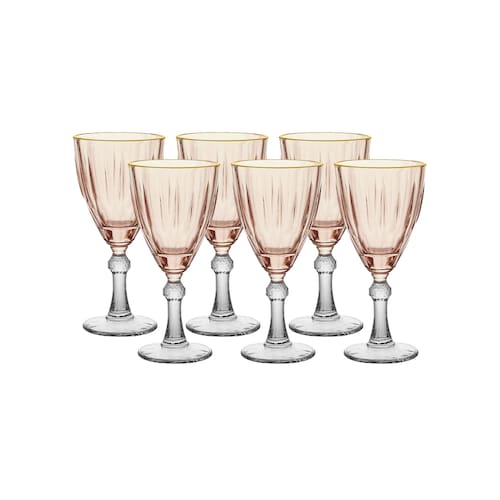 Conjunto de Taças Rosa Dominic para Água/Vinho – Sofisticação e delicadeza O Conjunto de Taças Dominic da Hauskraft é a escolha ideal para quem deseja aliar elegância à decoração da mesa. Composto por 6 taças em vidro na charmosa cor rosa com bordas douradas, cada peça possui capacidade de 275 ml e um design que transforma qualquer ocasião em um momento especial, seja para servir água ou vinho com requinte e bom gosto.