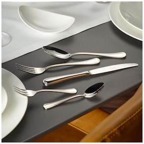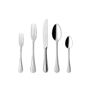 Este conjunto de mesa Merlemont, fabricado pela Villeroy & Boch, é uma opção de 5 peças que combina qualidade e elegância. As peças são feitas de aço inoxidável 1810 com acabamento espelhado e possuem tamanho europeu, garantindo conforto ao manuseio. O conjunto inclui: