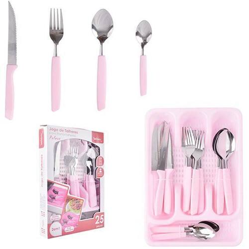 Conjunto De Talheres Com Porta Talher Rosa 25 Peças