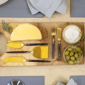Conjunto De Talheres Copa E Cia Para Queijo 3 Peças Garbo Stone Slim Conjunto de Talheres Copa e Cia para Queijo 3 Peças Garbo Stone Slim - Características Gerais do Produto: - Composição: Composição por linha de talheres:; Rattan: em aço inoxidável gold com cabo de rattan natural.; Atenas: em aço inoxidável gold com cabo de madrepérola.; Monza: em aço inoxidável silver com cabo de resina.; Goldwood: em aço inoxidável gold com cabo de madeira.; Turim: em aço inoxidável gold com cabo de resina.; Ilhéus: em aço inoxidável com cabo de resina.; Bamboo Natural: em aço inoxidável disponível nas versões gold ou silver, com cabo de bambu natural.; Bamboo: em aço inoxidável silver com cabo de bambu natural escuro.; Rattan Natural: em aço inoxidável silver com cabo de rattan.; Luma Silver: em aço inoxidável silver com cabo de acrílico.; Stone Slim: em aço inoxidável gold com cabo em resina.; Opal Wood: em aço inoxidável gold com cabo de madeira e resina. - Detalhes: Design Exclusivo Copa&Cia.; As cores podem sofrer pequenas alterações de cor, variando de monitor para monitor.; Os objetos que ambientam as fotos não acompanham o produto.; As fotos produzidas são apenas como sugestão de uso com as demais peças da coleção.; Cabo de Bamboo - Cuidados: O Atrito entre as Peças pode Danificar o Produto; Lavar com Detergente Neutro e Esponja Macia.; Não Deixar de Molho.; Armazenar em local seco e arejado.; Não podem ser colocados em lava-louças.; Não utilizar solventes, abrasivos ou alvejantes. - Dimensões (cm): Dimensão da Embalagem: Altura: 3 cm, Largura: 14 cm, Comprimento : 17,5 cm Acompanha o produto: - 3 Peças de Talheres para Queijo Garantia: - 7 dias/30 dias contra defeito de fabricação