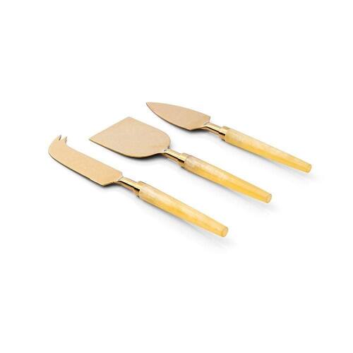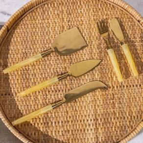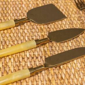 Conjunto De Talheres Copa E Cia Para Queijo 3 Peças Garbo Turim Conjunto de Talheres Copa e Cia para Queijo 3 Peças Garbo Turim - Características Gerais do Produto: - Composição: Composição por linha de talheres:; Rattan: em aço inoxidável gold com cabo de rattan natural.; Atenas: em aço inoxidável gold com cabo de madrepérola.; Monza: em aço inoxidável silver com cabo de resina.; Goldwood: em aço inoxidável gold com cabo de madeira.; Turim: em aço inoxidável gold com cabo de resina.; Ilhéus: em aço inoxidável com cabo de resina.; Bamboo Natural: em aço inoxidável disponível nas versões gold ou silver, com cabo de bambu natural.; Bamboo: em aço inoxidável silver com cabo de bambu natural escuro.; Rattan Natural: em aço inoxidável silver com cabo de rattan. - Detalhes: Design Exclusivo Copa&Cia.; As cores podem sofrer pequenas alterações de cor, variando de monitor para monitor.; Os objetos que ambientam as fotos não acompanham o produto.; As fotos produzidas são apenas como sugestão de uso com as demais peças da coleção.; Cabo de Bamboo - Cuidados: O Atrito entre as Peças pode Danificar o Produto; Lavar com Detergente Neutro e Esponja Macia.; Não Deixar de Molho.; Armazenar em local seco e arejado.; Não podem ser colocados em lava-louças.; Não utilizar solventes, abrasivos ou alvejantes. - Dimensões (cm): Dimensão da Embalagem: Altura: 3 cm, Largura: 14 cm, Comprimento : 17,5 cm Acompanha o produto: - 3 Peças de Talheres para Queijo Garantia: - 7 dias/30 dias contra defeito de fabricação