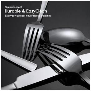Desfrute de jantares sem preocupações com o Conjunto de Talheres Brightown. Feito em aço inoxidável durável, com design ergonômico que proporciona conforto ao segurar. Este conjunto inclui 8 garfos de jantar, 8 colheres de jantar, 8 facas de jantar, 8 colheres de chá, 8 garfos de salada/sobremesa, além de 1 colher de sopa, 1 garfo de servir, 2 colheres de servir e 1 colher de açúcar. Resistente e elegante, com polimento espelhado que não precisa ser refeito. Fácil de limpar e seguro para máquina de lavar louça.
