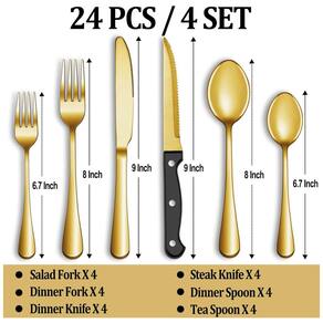 Aprecie a elegância e sofisticação do Conjunto de Talheres de Ouro de 24 peças da MUTNITT! Feito em aço inoxidável de alta qualidade, resistente à corrosão e durável, este conjunto inclui facas de jantar, facas de churrasco, garfos, colheres de jantar, garfos de salada/sobremesa e colheres de chá, essenciais para famílias ou restaurantes. Com um visual único em ouro, esse conjunto se destaca, trazendo um toque retro e vintage à sua mesa. Além disso, o design ergonômico das alças garante máximo conforto durante o uso. Ideal para uso diário, jantares ou festas, este conjunto é uma escolha luxuosa e elegante para criar uma atmosfera nobre em suas refeições. Cuide bem dos seus talheres lavando à mão e evitando materiais de limpeza abrasivos. Adquira já o seu e transforme suas refeições em momentos especiais!