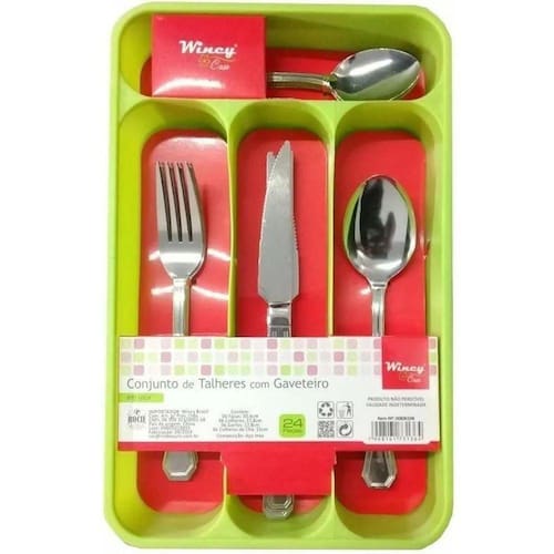 Conjunto de Talheres em Inox com Gaveteiro Kit 24 peças - Wincy Tamanho aproximado: 6 facas de mesa - 20,5cm 6 garfos de mesa - 19cm 6 colheres de sopa - 18,5cm 6 colheres de chá - 13,5cmTamanho aproximado do gaveteiro: 33x20cmPeso aproximado: 545gTipo de produto: conjunto de talheres / faqueiro com 24 peças + gaveteiroCor: VerdeComposição: inox e plástico