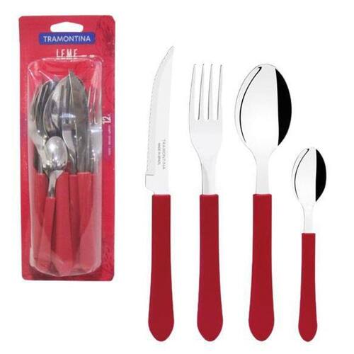 Conjunto De Talheres / Faqueiro De Inox Com 12 Pecas Cabo Vermelho Importante - Foto meramente ilustrativa (usada apenas para mostrar os ângulos do produto); - Este anúncio refere-se a 1 (uma) unidade; - Valor informado refere-se a 1 (uma) unidade;