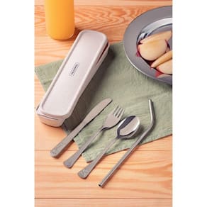 O conjunto de talheres infantis Tramontina em aço inox com estojo de 05 peças é o companheiro perfeito para acompanhar as refeições das crianças e bebês em qualquer ocasião! Ideal para passeios, levar para a escolinha ou acompanhar os pequenos em suas aventuras diárias, ele possui talheres e um canudo em tamanho compacto e feitos de aço inoxidável, um material de alta qualidade que não solta nenhum resíduo e é altamente durável - isso significa que eles manterão sua beleza por mais tempo e garantirão maior higiene para os pequenos. O estojo que acompanha o conjunto é livre de bisfenol A (BPA), não tóxico e ecologicamente correto, pois é composto por fibra de trigo com polipropileno. Sua limpeza é super fácil e agrega maior praticidade à sua vida, permitindo que você desfrute mais tempo com as crianças. Um conjunto que garante sua tranquilidade e torna a rotina muito mais funcional!