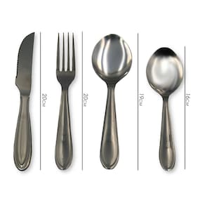Garfo: 20 cm x 2,2 cm Faca: 20 cm x 2 cm Colher de Mesa: 19 cm x 4 cm Colher de Chá: 16 cm x 4 cm