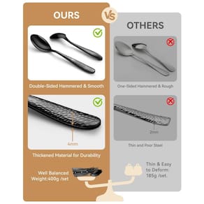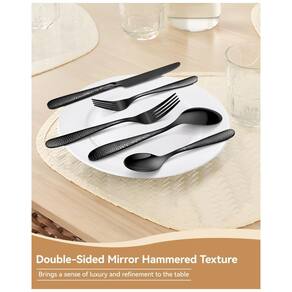 O Jogo de Talheres Preto para 8 pessoas da Aswwid é luxuoso e ideal para diversas ocasiões. Além do uso diário, é perfeito para reuniões familiares, festas, casamentos, churrascos, acampamentos, jantares e até para restaurantes, bares, cafés e hotéis. Com um design moderno e martelado, este conjunto de talheres em aço inoxidável de alta qualidade destaca-se pela elegância e sofisticação. Inclui 8 facas de carne afiadas para um corte preciso, garantindo resistência à ferrugem e corrosão. Peso robusto, resistência e acabamento impecável tornam este jogo de talheres um complemento elegante e funcional para sua mesa. Instruções de uso e cuidados: recomenda-se lavar à mão para maior durabilidade, porém também são seguros para máquina de lavar louça. Evite utensílios de limpeza duros que possam danificar o conjunto de talheres.