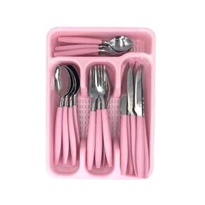 Conjunto de Talheres Rosa 24 Peças Porta Talher com Divisão Conjunto de Talheres Rosa 24 Peças Porta Talher com Divisão ===================================== Com design moderno e cabos na cor rosa, este conjunto oferece praticidade sem abrir mão da elegância, sendo perfeito tanto para uso diário quanto para ocasiões especiais.