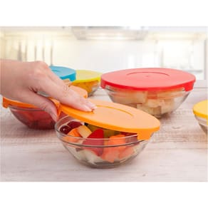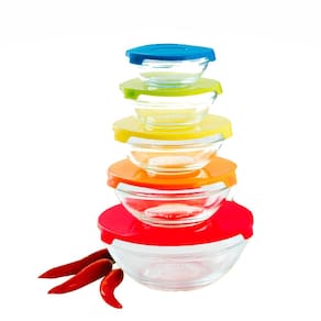 Esse Conjunto de 5 tigelas, da Casa Ambiente, é perfeito para várias finalidades. Feitas em vidro, com tampas plásticas e capacidades diferentes, se adequam a cada necessidade na hora de armazenar seus alimentos.