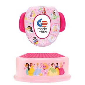 Disney Princess "Loving Life" Conjunto de 2 peças essencial para treinamento de penico – Almofada macia, treinamento de penico para bebês, seguro, fácil de limpar, banquinho - INCLUI: (1) assento de penico macio, (1) banquinho de degrau - Assento de vaso macio: cabe em banheiros regulares e alongados - Banco de degrau: Leve e antiderrapante - PERSONAGENS DIVERTIDOS: As princesas mágicas Disney ajudarão a tornar o treinamento do penico mais divertido! - FÁCIL DE LIMPAR: O assento do vaso sanitário e o banquinho são fáceis de limpar, basta limpar/limpar com sabão neutro e água