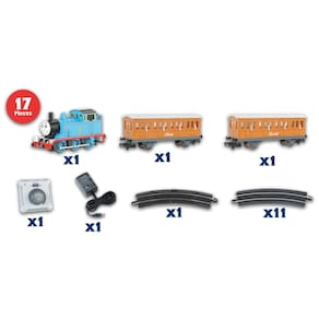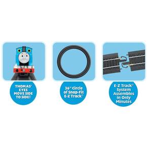 Conjunto de trem completo pronto para rodar Alimentado por um Thomas the Tank Engine com olhos em movimento Inclui Treinadores Annie e Clarabel com acopladores de gancho e laço de estilo internacional Marca: Não Informado