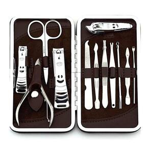 - Kit de unha com 12 peças: 1 cortador de unha grande, 1 cortador de unha médio, 1 cortador de unha pequeno, 1 alicate, 1 lixa, 1 pinça, 1 palito, 2 utensílios de desencravar unha, 1 tesourinha