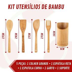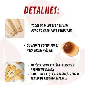 INFORMAÇÕES ADICIONAIS: Fáceis de limpar e guardar;Leves e versáteis;Matéria prima versátil, durável e autossustentável;Resistentes ao calor e seu cabo não aquece facilmente;Não absorvente, inodoro, sem sabor, sem substância tóxica e naturalmente antibacteriano. Suas fibras não possuem poros, não havendo acúmulo de resíduos;Todos os talheres possuem furo no cabo para pendurar;O suporte possui furos para drenar água;Pode haver pequenas variações por se tratar de produto natural;não danificam o revestimento antiaderente.CUIDADOS E CONSERVAÇÃO: Para limpeza, remova a sujeira com uma esponja macia, Lavar com água e sabão neutro utilizando esponja macia, seguido de pano seco;Não utilizar produtos químicos ou abrasivos na limpeza;Evite quedas para não danificar o produto;Não recomendável ir à lava-louças;Não use palha de aço;O único cuidado de manutenção é deixar secar em um local arejado e, a cada 6 meses, deve-se espalhar óleo mineral para revitalizar o bambu.Não pode ir ao forno;Não pode ir à lava-louça;Não pode ir ao micro-ondas;Para limpeza, remova a sujeira com uma esponja macia, Lavar com água e sabão neutro utilizando esponja macia, seguido de pano seco; MEDIDAS: