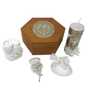 - Cor: cada peça do kit de batismo é na cor branca e a caixa é marrom, por isso é perfeita para meninos e meninas.