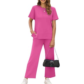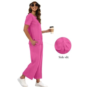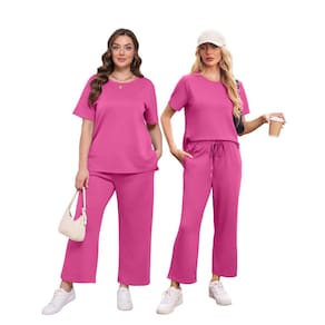 XIEERDUO Conjunto feminino de 2 peças, moda para viagem, agasalho, confortável, perna larga, P-3GG, Rosa choque - Tecido leve como o ar/fluxo de ar ideal/elasticidade em 4 direções. As 2 peças são feitas com tecido espaçador leve, macio e ultra drapeado, projetado para parecer sedoso em sua pele. - Gola redonda básica/manga curta/blusa com fenda lateral. Esta túnica confortável é longa o suficiente para cobrir seus quadris, esconder sua barriga - Comprimento curto (9/10)/ Calça com cordão de cintura elástica/calça de moletom de perna larga. Calça com dois bolsos laterais práticos, ajuda a segurar seu celular, chaves, moedas e batons facilmente, pare de se preocupar com onde colocar seu telefone enquanto você está trabalhando/praticando esportes - Pode ser vestido por cima ou por baixo, ótimo para uso casual/vestir-se/férias/viagens/negócios casuais/trabalho/exercícios - Lavar à máquina em água fria, secar em temperatura baixa ou pendurar para secar. Passar a ferro em configurações baixas. A embalagem Acuum pode causar rugas na parte superior, mas lavar ou passar a ferro as refrescará