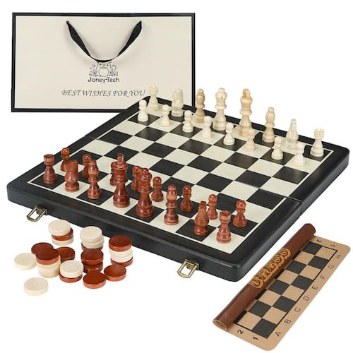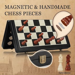 Eleve sua noite de jogo com este requintado conjunto de xadrez e damas de madeira. Feito com atenção meticulosa aos detalhes, este clássico atemporal combina funcionalidade e elegância. A estrutura de madeira maciça exala calor e durabilidade, garantindo inúmeras horas de jogo estratégico. Cada peça de xadrez intrincadamente esculpida é uma obra de arte, convidando você a mergulhar na rica história desses jogos reverenciados. Seja você um jogador experiente ou apresentando uma nova geração às alegrias do jogo de xadrez e das damas, este conjunto promete uma experiência incomparável. Reúna seus entes queridos, participe de uma competição amigável e crie memórias queridas que durarão uma vida inteira. Com seu design de qualidade de herança, este conjunto de xadrez está destinado a se tornar um bem precioso da família, passado de geração em gerações. - ? Conjunto de xadrez de luxo de 40,6 cm: o tabuleiro de xadrez magnético Joneytech é feito à mão de madeira maciça de alta qualidade, garantindo durabilidade e acabamento elegante do tabuleiro de xadrez que melhora o apelo estético, perfeito para qualquer entusiasta de xadrez. - ? Conjunto de tabuleiro de xadrez magnético: cada peça de xadrez tem forte magnetismo, ajudando-as a permanecer no lugar e se o jogo estiver em pausa. As peças não caem nem mesmo do tabuleiro de xadrez viram de cabeça e caem, onde quer que você leve para viajar em cartão ou avião. (Damas não magnéticas) - ?Tabuleiros de xadrez duplos para casa ou portátil: vem com um tabuleiro de xadrez de madeira dobrável, um produto mais profissional para todos os entusiastas de jogos de tabuleiro. E um tabuleiro de xadrez de silicone dobrável para portabilidade leve. Se você estiver viajando ou desfrutando de um jogo descontraído em casa, este conjunto de tabuleiro de xadrez tem o que você precisa. - ? Compartimentos de armazenamento portáteis e convenientes: os conjuntos de xadrez de madeira funcionam como uma caixa de armazenamento com compartimentos individuais para armazenar peças de xadrez e damas. Este design multifuncional mantém tudo organizado e pronto para diversão em movimento, tornando-o o companheiro perfeito para viagens, piqueniques ou reuniões casuais. - ?Presente perfeito para qualquer ocasião: Lindamente embalado em uma caixa de presente luxuosa com uma bolsa de presente adicional, o conjunto de xadrez Joneytech é um presente ideal para qualquer ocasião. Seja para aniversários, Natal ou eventos especiais, atende a iniciantes e profissionais, oferecendo um presente atencioso e elegante para crianças, adultos e entusiastas de xadrez.