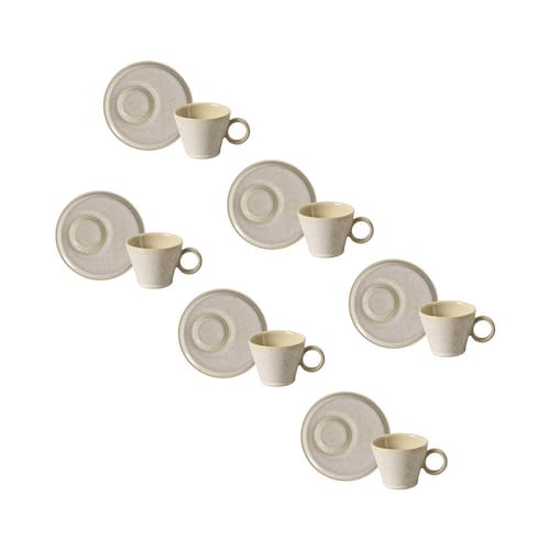 Funcionalidade e qualidade superiores Feito em Stoneware, um material cerâmico resistente, o conjunto é composto por 6 xícaras de 210ml e 6 pires, sendo perfeito para reuniões com amigos ou um chá relaxante. Além disso, este conjunto é compatível com micro-ondas e lava-louças, tornando o uso mais prático e facilitando a sua rotina.