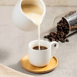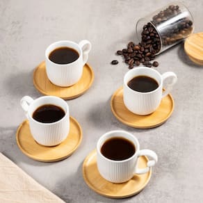 Elegância Duradoura: O design branco sofisticado e os pires de bambu criam um conjunto harmonioso, agregando charme e requinte a qualquer ambiente.
