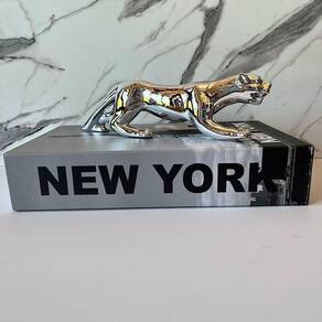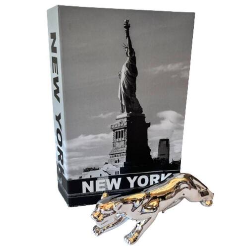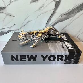 Livro de papelão decorativo estampa 'New York' e escultura Pantera prata de cerâmica.