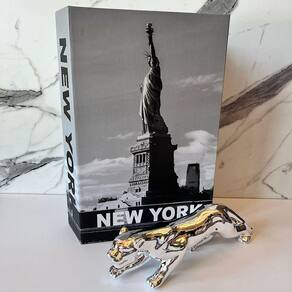 Nada mais encantador, original e inspirador do que utilizar livros na decoração de diversos ambientes, como salas de estar, escritórios, quartos, home office e onde mais sua imaginação permitir. Os livros decorativos são a mais nova tendência na decoração contemporânea e permitem diversas combinações e utilizações, dando um ar de sofisticação em mesas de centro, aparadores, prateleiras, escrivaninhas etc. Esse lindo livro estampa 'New York', irá encantar você pela riqueza de detalhes e qualidade no acabamento, junto da escultura Pantera prata de cerâmica que da um toque especial no ambiente.