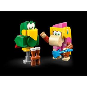 2 personagens LEGO® Super MarioTM do lar na selva do Donkey KongTM – A Dixie Kong com um elemento de guitarra e Squawks, o papagaio, com um microfone construível, bem como bongôs construíveis e um amplificador