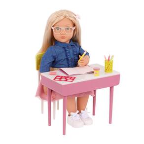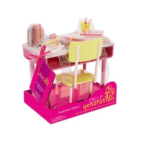 Proporcione às bonecas de 46cm um espaço elegante para escrever, desenhar e sonhar com o conjunto de escrivaninha e cadeira Our Generation Imagination Station! Este conjunto resistente e durável oferece uma escrivaninha em tamanho de boneca com 2 áreas de armazenamento para organizar materiais e acessórios. Além disso, inclui adesivos para as crianças decorarem, aumentando a diversão! Com mais de 30 peças de brincadeira, este conjunto é perfeito para contar histórias emocionantes. Adicione estilo às casinhas de boneca e outros conjuntos de móveis para bonecas.