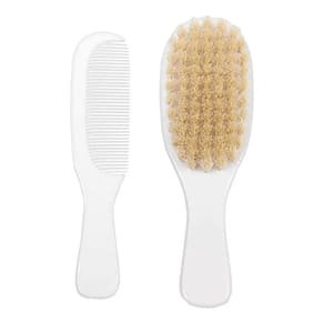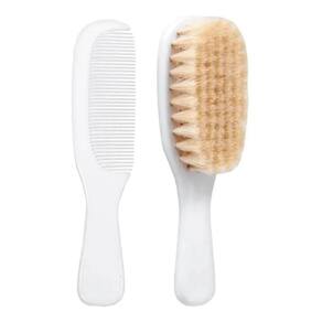 A escova possui cerdas naturais de carneiro macias e o pente possui as pontinhas arredondadas, ideais para o couro cabeludo do pequeno.