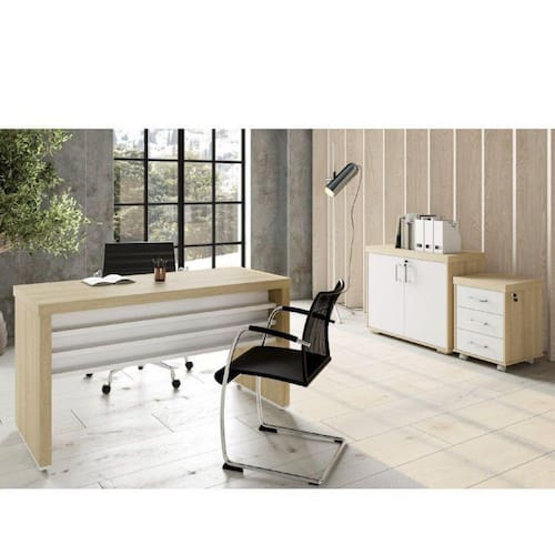 A mesa encanta com suas longarinas horizontais, tampo espaçoso e acabamento BP ideais para melhor desempenho.