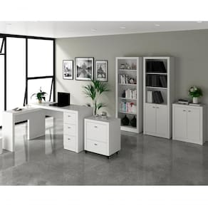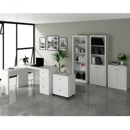 Conjunto Para Escritorio Tecno Mobili, móveis de qualidade que oferecem durabilidade e resistência, com estrutura em MDP de 15mm, pintura com acabamento em BP (Fosco). Escrivaninha de canto com reversível, gavetas com corrediças metálicas, tampo do balcão menor suporta até 13 kg, Estante livreiro com 04 prateleiras resistentes, Gaveteiro com suporte para pastas suspensas (pastas não inclusas) e com 4 rodizios, portas com dobradiças metálicas, prateleiras resistentes que suportam até 12 kg cada, puxadores modernos, possui amplo interno para organizar a papelada do trabalho ou os livros de estudo, este Conjunto Escritório da Linha Tecno Mobili, possui diversas peças que são vendidas separadamente, são ideais pra você compor o melhor projeto pra seu escritório. Este móvel chegará em sua casa separado em 05 volumes.