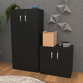 Aumente a produtividade com este conjunto de móveis para escritório, composto por uma mesa em L espaçosa e robusta, um gaveteiro volante móvel e prático, um armário alto para armazenamento e um armário baixo para organização diária, tudo com design moderno e materiais de alta qualidade.