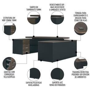 - Mesa acompanha sistema conectividade com saída para tomadas.