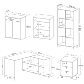 Conteúdo da Embalagem: 1 Mesa em L, 1 Estante, 1 Balcão, 1 Gaveteiro.