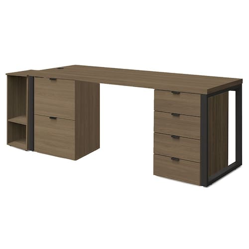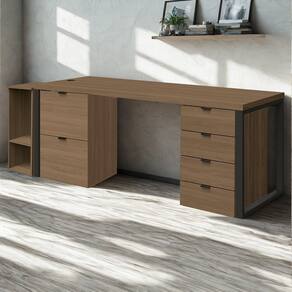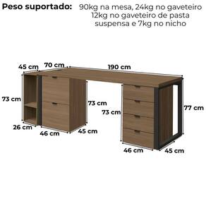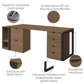 Conjunto para Escritório Frame 04 peças com design industrial e estrutura funcional. Estrutura 100% MDP (tampo mesa 40 mm, demais módulos 15 mm) com acabamento em pintura BP. Acompanha Mesa, 2 gaveteiros e suporte para CPU. Conjunto equipado com gaveta pasta suspensa, passa fios com tampa embutida, corrediças telescópicas, pés metálicos com pintura epóxi fosca, sapatas niveladoras e puxadores em alumínio. Indicado para salas de reunião, diretoria ou ambientes corporativos, com disposição de montagem conforme a necessidade do cliente. Estes produtos serão entregue em 05 volumes