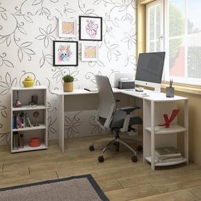 A mesa contém oito nichos para organizar objetos de decoração e livros. Montagem em formato em L, pode ser montada para o lado direito ou lado esquerdo