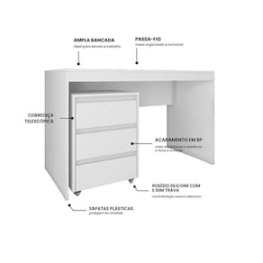 Nota: Imagens meramente ilustrativas. Acabamento do Tampo: BP Acompanha Manual de Instalação: Sim Ambiente Principal: Escritório Complexidade da Montagem: Média: pode ser montado por mais de uma pessoa e/ou necessite de maior conhecimento para montagem Cor: Branco Cor da Base: Branco Cor do Produto: Branco Cor do Tampo: Branco Cor Interna: Branco Dobrável: Não Escala de Brilho: Fosco Espessura do Tampo: 15 mm Formato: Retangular Gaveta com Chave: Não Itens Inclusos: gaveta Manual de Montagem e Instalação: https://cdn2.madeiramadeira.com.br/atributo/inusitta-ambientes-planejados/2411491-6014-17278051792201.pdf Material da Estrutura: MDP Material do Puxador da Gaveta: MDP Material do Tampo: BP Material Principal: MDP Necessita Montagem: Sim Origem do Produto: Nacional Peso: 15 kg Peso Máximo por Gaveta: 5 kg Possui Painel: Não Possui Passa Cabos: 01 Possui Porta Objetos: Não Possui Prateleiras: Não Possui suporte para CPU: Não Possui Suporte para Teclado: Não Possui Vidro: Não Quantidade de Gavetas: 03 Gavetas Recomendações de Uso, Manutenção e Limpeza: Pano molhado e pano seco Sistema de Montagem: Kit acessórios Tipo de Corrediça da Gaveta: Metálica Telescópica Marca: Inusitta