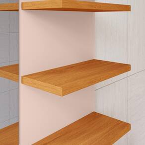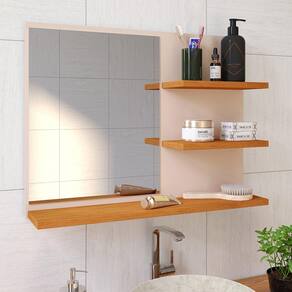 A espelheira Astra apresenta um design minimalista, contendo prateleiras na lateral e parte inferior podendo ser utilizadas para acomodar itens de uso diário ou objetos decorativos