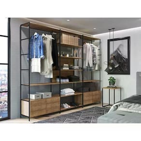 Conjunto Estantes Para Closet 04 Peças, com desing versátil, pode ser utilizada no quarto, no closet, na lavanderia ou até como expositor para uma loja de roupas com decoração, Combo 27801 da Linha Steel Quadra, Estilo Industrial, minimalista e com combinação entre vários módulos. Estrutura metálica em Aço com espessura de 15mm, pintura anticorrosiva, e em MDP, acabamento em pintura BP na cor Vermont (Fosco). Composto por 04 gavetas com corrediças metálicas, 02 cabideiros, 08 prateleiras garantindo muito mais espaço para organização dos seus itens, suporta até 5 kg cada uma, acompanha uma mesa de apoio baixa para completar esta composição super elegante. Mais produtos da Linha Steel Quadra, você encontra em nosso site, podendo fazer a composição completa para sua casa, são diversos itens com design prático e funcional para tornar a vida mais facil e a casa mais alegre. Estes móveis chegaram em sua casa separados em 04 volumes.