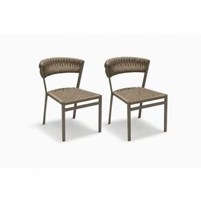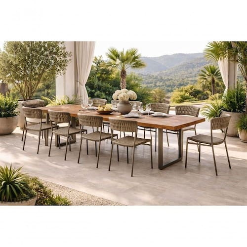 As 10 cadeiras que acompanham o conjunto foram cuidadosamente projetadas para unir conforto e elegância. Fabricadas em alumínio, são leves, resistentes à corrosão e ideais para áreas externas. O assento e o encosto recebem trico náutico, um material nobre, extremamente confortável, de fácil manutenção e próprio para uso ao ar livre, além de agregar um visual contemporâneo e sofisticado ao conjunto.
